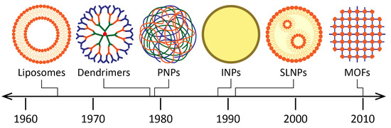Schematic representation of the main nanosized drug delivery systems for biomedical applications discovered over time. PNPs: polymeric nanoparticles; INPs: inorganic nanoparticles; SLNPs: solid lipid nanoparticles; MOFs: metal–organic frameworks.
