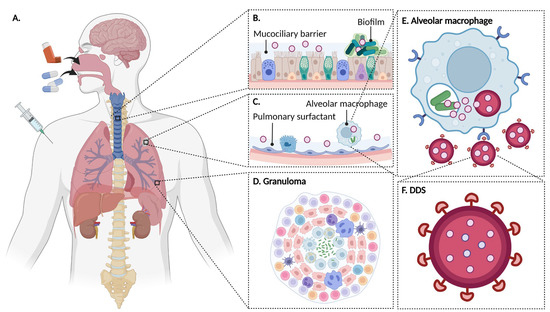 Use of nanosized drug delivery systems (DDSs) to fight tuberculosis. (A) Nanosized DDSs can be used to track Mycobacterium tuberculosis (Mtb) not only in the lungs (the site of infection in most clinical cases) but also in cases of extra-pulmonary tuberculosis, reaching organs such as the bones, brain, eyes, liver, kidneys or spleen. Therefore, DDSs can be administered intravenously, orally or pulmonary, with the latter being of particular interest. (B) Trachea and bronchioles constitute the first barrier for the nanosized DDSs during pulmonary administration. Exogenous particles such as NPs can be removed by means of mucociliary clearance, where the periciliary and mucus layers play a crucial role. The Mtb biofilm is another obstacle for drug nanocarriers. (C) If DDSs overcome the previous barriers, they will later face the clearance mechanisms in the alveoli. In these cavities, DDSs are at the mercy of pulmonary surfactant and the host’s immune defenses. Alveolar macrophages and dendritic cells readily uptake NPs. (D) Granulomas are formed in the lungs in order to contain the Mtb infection, and are another biological barrier for NPs. (E) Targeting alveolar macrophages with NPs is an attractive strategy. Whereas free drugs often poorly penetrate inside infected macrophages, nanocarriers can act as “Trojan horses” to carry drugs inside the cells. Nanocarriers can also be coated with ligands such as mannose for active targeting. (F) DDSs are engineered to overcome multiple barriers in the body and achieve drug delivery at Mtb locations. Drugs are (co-)encapsulated in the NPs’ cores, whereas coatings can modulate the interactions with the biological medium. Created with BioRender.com.