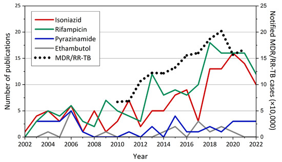 Number of publications discussing the incorporation of first-line antitubercular drugs into nanocarriers. The search was carried out in Scopus in December 2022 using the nanocarriers described in this review as keywords. The dotted line shows the cases of multidrug-resistant/rifampicin-resistant tuberculosis (MDR/RR-TB) according to the annual reports of the World Health Organization. The drop in diagnosed cases from 2019 to 2020 is a consequence of the coronavirus pandemic.