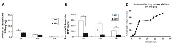 (A,B) Intracellular rifampicin (RFP) concentrations per mg of protein in alveolar macrophages (AM) (white) and in type II alveolar epithelial cells (AECs) (black) after pulmonary administration of 1 mg/kg in rats. n > 3. Symbol ** denotes p < 0.05. (A) Results for free RFP. (B) Results for RFP-loaded solid lipid nanoparticles. Reference [98], copyright (2022) by Copyright Clearance Center, with permission from Springer Nature. (C) Percentage of RFP released from chitosan nanoparticles over time in artificial synovial fluid. Reference [104], copyright (2022) by Copyright Clearance Center, with permission from Springer Nature.