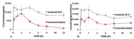 Concentration profiles for free isoniazid (INH) (red) and for INH-loaded solid lipid nanoparticles (SLNPs) (blue) after the oral administration of 25 mg/kg in rats. n = 6. (A) Results in plasma. (B) Results in the brain. Adapted from reference [107], copyright (2022) by Copyright Clearance Center, with permission from Elsevier.