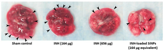 Lung tissues from untreated mice, from mice treated with free isoniazid (INH), and from mice treated with INH-loaded mesoporous silica nanoparticles (SiNPs) administered intravenously or subcutaneously. Black arrows indicate granulomas visible to the naked eye. Adapted from reference [118], copyright (2022) by Copyright Clearance Center, with permission from John Wiley and Sons.