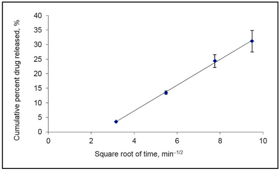 The plot becomes linear after an initial lag time, indicating a diffusion-prolonged release from the Weblike film. A slope of 4.42% released per min1/2 and R2 of 0.99 were calculated from the plot in Figure 2. Fick’s law of diffusion provides the fundament for the description of solute transport from a polymeric matrix film [30].