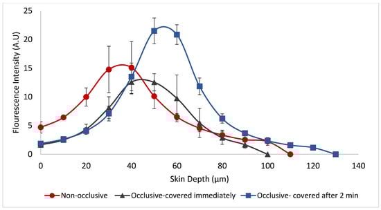 The various fluorescence intensity values at their maximum point were 15.1, 12.5 and 21.5 A.U. for non-occlusive, occlusive covered immediately and occlusive covered 2 min after application, respectively. These maximum values were measured at skin depths of 40 microns for the opened and the immediately covered application and 50 microns for the non-immediate occlusive one. The calculated area under the curve (AUC) values were 839.6, 614.7 and 983.5 AU. µm for the opened application, immediately occlusive application and the occlusive after two minutes application, respectively.