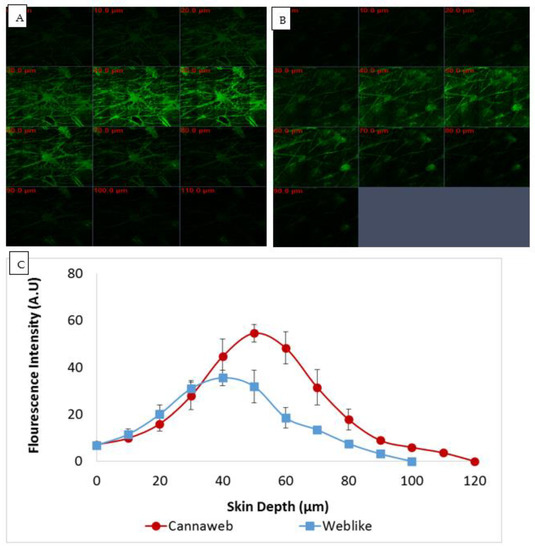 The fluorescent signal of FITC reached a skin depth of 120 µm for Cannaweb, compared to only 100 µm for the system lacking the oil. The most intense fluorescence was seen at a depth of ~40–60 microns.