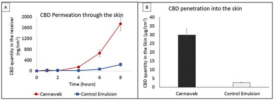 The goal of this experiment was to evaluate the permeation and penetration of CBD Cannaweb system into and across the skin in comparison with a conventional topical dosage form, the emulsion. The in vitro results presented in Figure 6, indicate that at the initial time points (1–2 h), Cannaweb and the emulsion system led to similar CBD permeation of 9.3 ± 1.0 and 10.4 ± 3.5 ng/cm2, respectively. After this point, the delivery of CBD from Cannaweb started to rise, reaching a value of 114.3 ± 39.8 ng/cm2 compared to only 15.4 ± 4.1 ng/cm2 for the emulsion. By the end of the 8 h, the cumulative permeated CBD amount from Cannaweb vs. the control emulsion was 1745.2 ± 249.4 and 236.1 ± 71.0 ng/cm2, respectively.
