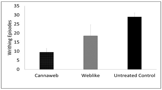 Mean writing counts in mice treated with 100 mg/kg CBD topically from F16 (Cannaweb containing 3% HSO), (n = 5) and F17 (Weblike not containing HSO), (n = 4), each containing 5% w/w CBD. The treatment was carried out 1 h prior to IP injection of acetic acid and, compared to untreated control mice, received an IP injection of acetic acid (n = 4) (Mean ±SD). p < 0.01 (considered very significant) for Cannaweb containing HSO vs. Untreated control group, p < 0.05 (considered significant) for Cannaweb containing 3% HSO vs. Weblike not containing HSO, by One-Way ANOVA.