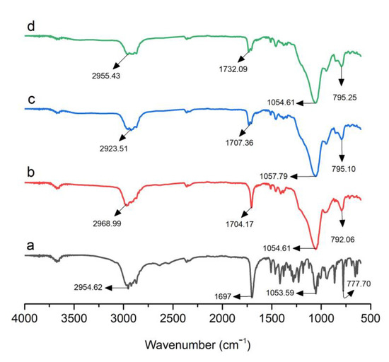 FTIR spectra of (a) Dex, (b) S1, (c) S18, and (d) S23.