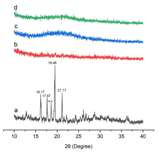 X-ray diffraction was used to examine the physical state of Dex and optimized formulations as presented in Figure 3. The pure Dex showed its diffraction peaks at 16.17°, 17.67°, 18.58°, 19.48°, and 21.17°. There were also a few dull peaks after 21.17°. Similar peaks were reported in the literature, indicating the crystalline nature of Dex [39].
