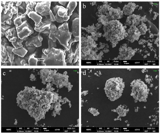 The surface morphology of pure Dex and optimized formulations were examined using SEM. The Dex image showed rectangular crystals with a smooth surface (Figure 4a), consistent with previous studies [41]. BSD and TSD appeared in aggregated clusters, which might be due to the high surface free energy of carriers [42]. No drug crystals were observed in the optimized formulations, indicating entrapment of the drug within the pores of silica in amorphous form and further confirming the XRD findings. The literature supports our findings, whereby drug confinement to silica pores prevents recrystallization of the drug, resulting in powdered dispersions. This helps to improve the solubility of the drug [27,43,44].