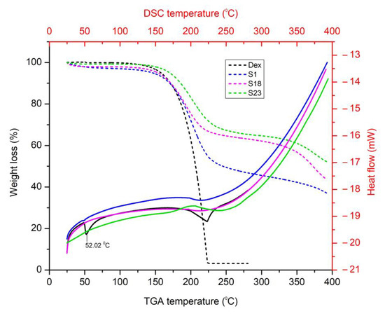 TGA and DSC graphs of Dex, S1, S18, and S23.