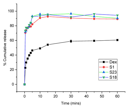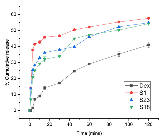 The infrared spectra of pure Dex and optimized formulations, i.e., S1, S18, and S23, are presented in Figure 2. Pure Dex exhibited typical absorption peaks at 2954.62, 1697, 1053.59, and 777.70 cm−1 denoting C–H stretching, C=O stretching, O–H bending, and C–H bending, respectively (Figure 2). Syloid 244FP® showed a strong absorption peak at 1072.35 cm−1 due to siloxane (Si–O–Si) stretching vibration. According to the literature, Gelucire 48/16® showed peaks at 2884.30 cm−1 due to C–H stretching. The band at 1102.64 cm−1 corresponded to C–O stretching. Poloxamer 188® exhibited sharp peaks at 2879.52, 1341.51, and 1097.59 cm−1 due to C–H stretching, in plane O–H bending, and C–O stretching, respectively. In the case of S1, S18, and S23, the absorption peaks of Dex were shifted from 1697 to 1704.17, 1732.16, and 1732.09 cm−1. This is possibly due to the weak interaction of Dex with the mesoporous surface, which is reversible in nature, as mentioned in the literature [27,36,37].