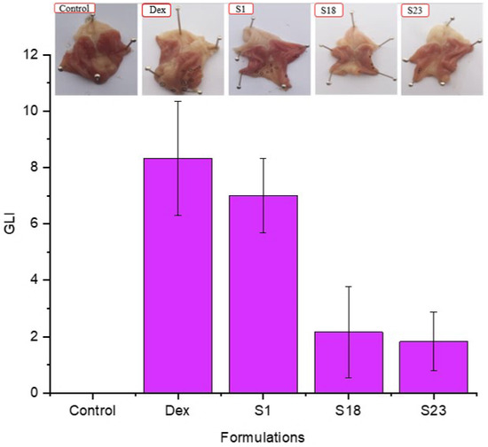 Albino rats weighing 160–240 g of either sex were selected to compare the ulcerogenic potential of Dex and optimized formulations. Animals were divided into five groups. Animals were kept at a temperature of 25 ± 3 °C under a 12 h light/dark cycle for 14 days prior to the experiment. The Ethical Review Board of Government College University Faisalabad approved all the protocols via letter with reference no. GCUF/ERC/2198. The animals fasted for 12 h before commencement of the experiment but were allowed to drink water freely. S1, S18, S23, and pure Dex were given orally (120 mg/kg) for 5 days in a suspension of carboxymethyl cellulose (CMC) (1 mL of 0.5% w/v). All animals in the control group only received 1 mL of suspension (0.5% w/v CMC). After 5 days, animals were sacrificed after 4 h of dosing [26].