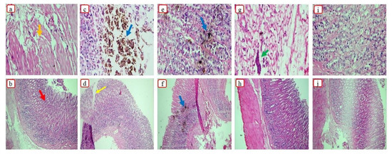 Histological presentation of rat’s stomach in the (a,b) control, (c,d) Dex, (e,f) S1, (g,h) S18, and (i,j) S23 groups. Here, the orange arrow indicates the mucosa, the red arrow indicates gastric pits, the blue arrow indicates necrotic lesions, the yellow arrow indicates the damaged epithelium, and the green arrow indicates fibrin deposition.