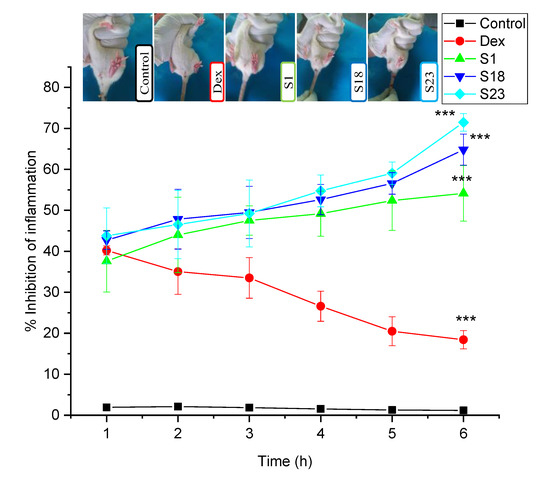 Photographs of rat paw edema after 6 h and percentage inhibition of carrageenan-induced paw edema in rats. The error bar designates the standard deviation (n = 3). Here, the control refers to the diseased group, which did not receive any treatment. Here, level of significance was slightly significant, moderately significant and highly significant (*** p < 0.001) for all treatment groups when compared with control group.