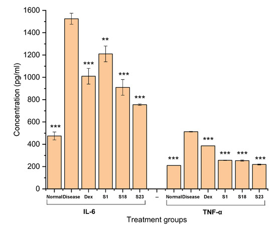 The S1-treated group presented a high IL-6 level (1210 ± 70.71 pg/mL) in comparison with the Dex, S18, and S23 groups (Figure 11). This behavior was due to the toxic effects of silica [62]. On the other hand, the S23 group showed significantly low levels of IL-6 when compared with the diseased group, representing the efficacy of the TSD formulation in inhibiting inflammation.
