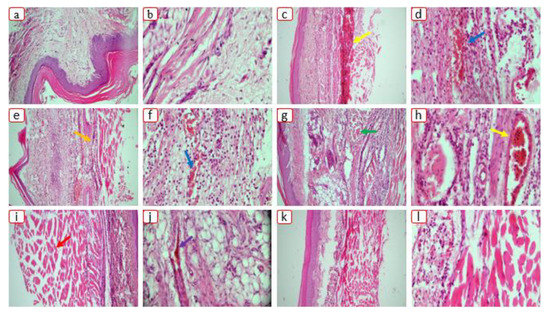 Histological appearance of the rat paw edema in (a,b) normal group, (c,d) diseased group, (e,f) Dex group, (g,h) S1group, (i,j) S18 group, and (k,l) S23 group. Here, the yellow arrow indicates cellular infiltration, blue arrow indicates inflammation, orange arrow indicates hyperplasia, green arrow indicates giant cells, red arrow indicates blood vessel, and purple arrow indicates bone erosion.
