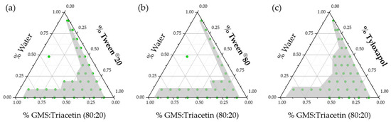 | Phase Diagram Region | Code | Lipid Mix % (GMS: Triacetin 60:40) | Surfactant % (Tyloxapol) | Water % | Warm Microemulsion | Redispersed 1:20 Product | |