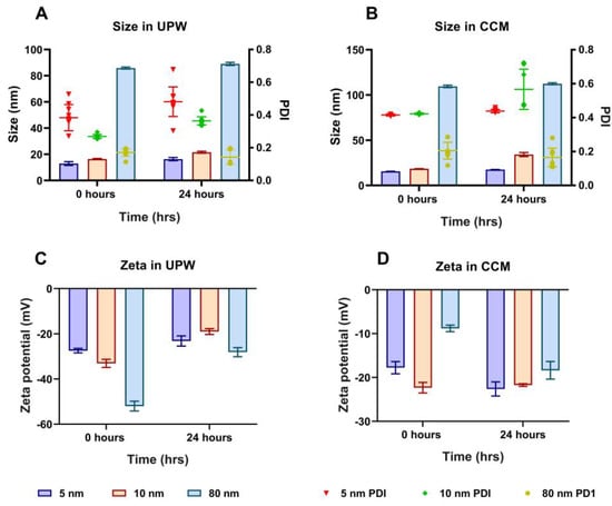 Characterisation of different sizes of AuNPs by DLS in UPW and CCM. Hydrodynamic size distribution and PDI of 5, 10, and 80 nm AuNPs in (A) UPW after 0 and 24 h and (B) CCM after 0 and 24 h. Zeta potential values of 5, 10, and 80 nm AuNPs in (C) UPW after 0 and 24 h and (D) CCM after 0 and 24 h. Plotted graphs represent the means ± standard deviation (SD) of 10 different measurements.
