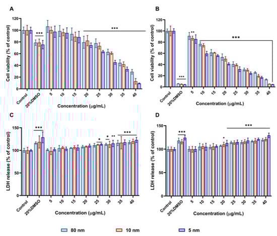 Cell viability and lactate dehydrogenase (LDH) release of A549 cells treated with 5–40 µg/mL of different sizes of AuNPs measured using MTT and LDH assays. Percentage of cell viability after incubation with AuNPs for (A) 24 h and (B) 48 h. Percentage LDH release in media after incubation with AuNPs for (C) 24 h and (D) 48 h. 20% DMSO was used as a positive control. Plotted graphs represent the means ± SD of six independent experiments. Bars with an asterisk (*) show statistical differences (* p < 0.05, ** p < 0.01, and *** p < 0.001) compared with the control.