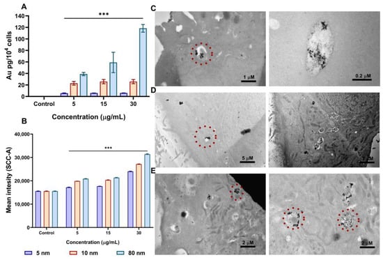 Cellular uptake of different sizes of AuNPs in A549 cells after 24 h incubation. (A) The Au content in A549 cells measured with inductively coupled plasma mass spectrometry (ICP-MS) (B) Side scatter (SSC) intensity changes due to the uptake of AuNPs analysed using flow cytometry. TEM Images of the internalisation of AuNPs into A549 cells after treatment with 30 µg/mL for 24 h of (C) 5 nm, (D) 10 nm, and (E) 80 nm AuNPs. AuNPs are indicated by circles. Plotted graphs represent the means ± SD of three independent experiments. Bars with an asterisk (*) show a statistical difference (*** p < 0.001) when compared with the control.
