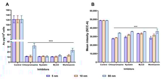 Effects of pharmacological inhibitors on the internalisation of different sizes of AuNPs (30 µg/mL) in A549 cells. Cells were separately pre-incubated with chlorpromazine, nystatin, MβCD, and wortmannin for 1 h, followed by incubation with AuNPs for 3 h and analysed by (A) ICP-MS and (B) flow cytometry. Plotted graphs represent the means ± SD of three independent experiments. Bars with an asterisk (*) show a statistical difference (*** p < 0.001) when compared with the control.