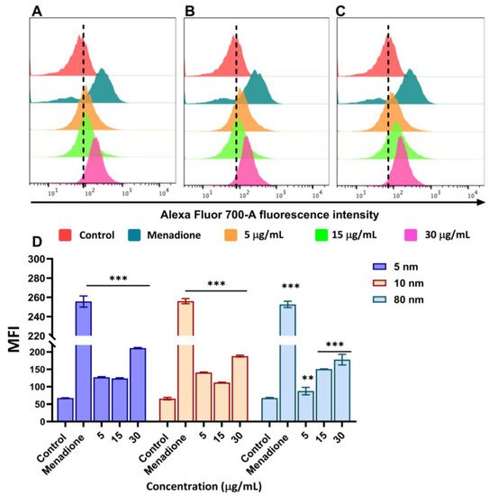 ROS production in A549 cells following exposure to different sizes of AuNPs analysed using flow cytometry with the CellRox deep red kit. Histograms of flow cytometry treated with (A) 5 nm (B) 10 nm and (C) 80 nm AuNPs. (D) Bar graphs represent the median fluorescence intensity (MFI) of A549 cells exposed to 5, 10, and 80 nm AuNPs. Menadione (50 µM) was used as a positive control. Plotted graphs represent the means ± SD of three independent experiments. Bars with an asterisk (*) show a statistical difference (** p < 0.01, and *** p < 0.001) when compared with the control.