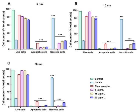 Bar graph analyses of apoptosis and necrosis assessed by flow cytometry after the incubation of A549 cells with (A) 5 nm, (B) 10 nm, and (C) 80 nm AuNPs at concentrations of 5–30 µg/mL. Treatment with 1 µM of staurosporine and 10% DMSO for 6 h were used as positive controls for apoptosis and necrosis, respectively. Plotted graphs represent the means ± SD of three independent experiments. Bars with an asterisk (*) show a statistical difference (*** p < 0.001) when compared with the control.