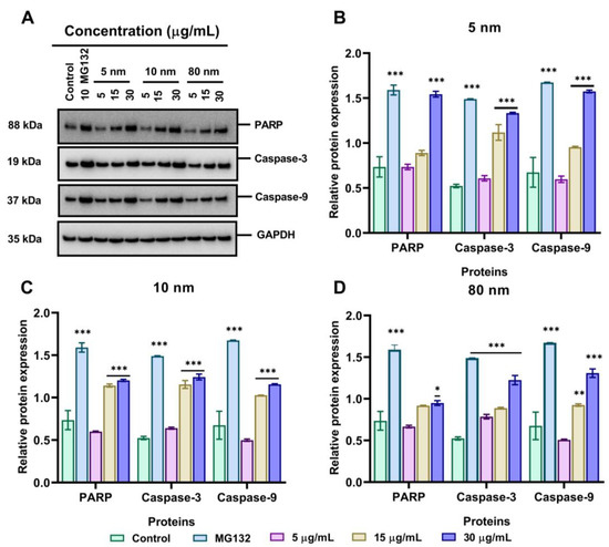We next assessed the induction of apoptosis of 5, 10, and 80 nm AuNPs by checking the expression of Poly (ADP-ribose) polymerase (PARP), caspase-3, and caspase-9 when incubated with 5–30 µg/mL AuNPs for 24 h. Following exposure to 5 µg/mL AuNPs, the expression of PARP and caspase-3 did not increase compared to the control. As cells were incubated with 15 µg/mL AuNPs, PARP, caspase-3, and caspase-9 were slightly upregulated as shown in Figure 8A. As the concentration increased to 30 µg/mL AuNPs, PARP, caspase-3, and caspase-9 were significantly upregulated, indicating the induction of apoptosis at higher concentrations. As shown in Figure 8B, the relative protein expression of pro-apoptotic proteins was upregulated in a dose-dependent manner when incubated with 5 nm AuNPs with the highest concentration showing a higher upregulation of PARP (1.54), caspase-3 (1.33), and caspase-9 (1.57) compared to the control (0.522) (p < 0.001). In addition, Figure 8C shows that the relative protein expression of PARP, caspase-3, and caspase-9 was significantly increased when treated with 30 µg/mL of AuNPs as shown in Figure 8C. Likewise, following the treatment of A549 cells with 80 nm AuNPs, the relative protein expression of PARP, caspase-3, and caspase-9 increased but to a lesser extent compared to 5 and 10 nm AuNPs (p < 0.001) (Figure 8D).