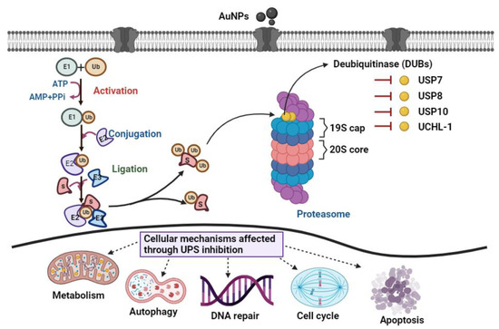 The UPS is the major intracellular pathway for the degradation of 80–90% of proteins in eukaryotic cells [27,28]. During the process, ubiquitin (76 amino acids) covalently binds to the proteins to be degraded in the proteasome. This is accomplished by three enzymes: ubiquitin-activating enzymes (E1), ubiquitin-conjugating enzymes (E2), and ubiquitin ligases (E3) (Scheme 1) [29,30]. DUBs reverse the degradation process by removing the covalently attached ubiquitin from proteins, allowing the recycling of ubiquitin for further use by the proteasome [31]. The enzymes play an important role in controlling the process and are involved in many signalling activations such as DNA repair, apoptosis, and cell cycle progression [32,33]. Due to their regulatory functions, tumour cells have been demonstrated to depend on DUBs for proliferation [34,35]. Recently, many molecules have been tested for their toxicity against DUB activity and implicated in cancer treatment. For instance, cisplatin has been shown to suppress the proliferation of ovarian cancer through proteasome inhibition [36]. In breast cancer, the small molecule bis-benzylidine piperidone 15 (b-AP15) and platinum pyrithione (PtPT) were tested against elevated USP14, UCHL-5, and RPN11 proteases. These compounds were found to induce cell cycle arrest and cell death associated with caspase activation, endoplasmic reticulum stress, and downregulation of the endoplasmic reticulum by downregulating DUBs [37]. Although these compounds have shown a promising effect, there is still the issue of their limited efficacy, specificity, and biocompatibility [38]. Therefore, alternative DUB inhibitors are urgently needed in cancer treatment to improve efficacy and biocompatibility. Herein, we first investigated whether different sizes of AuNPs (5, 10, and 80 nm) coated with citrate can affect the UPS, with a particular focus on DUBs such as the ubiquitin-specific protease (USP) and ubiquitin carboxyl-terminal hydrolase L1 (UCHL-1) in A549 cells. Extensive insight into the underlying mechanisms of AuNPs toxicity in A549 cells was further investigated by assessing their metabolic activity, ROS, expression of apoptotic-related proteins, and their cellular uptake mechanisms.