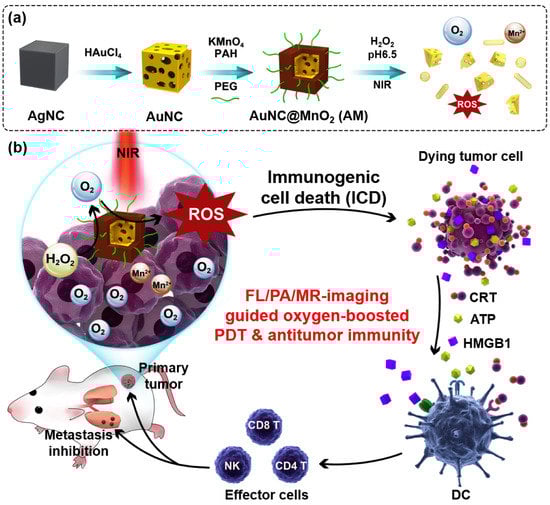 Schematic representation of (a) synthesis of AuNC@MnO2 (AM) and (b) imaging-guided PDT ef-ficiency of AuNC@MnO2 (AM) reproduced with permission [125]. Copyright 2018 Elsevier.