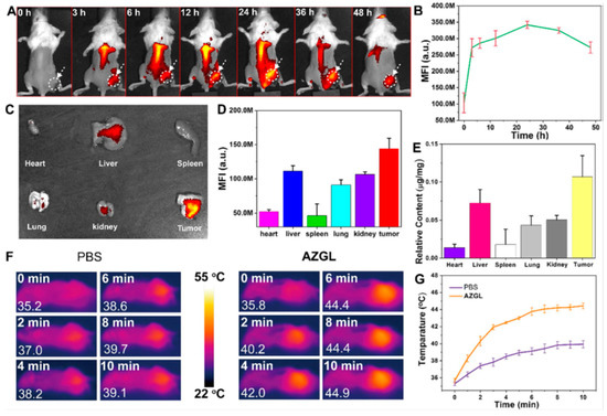 (A) In Vivo FL images (B) mean fluorescence curve after i.v. of AZGL (C) Ex-vivo fluorescence imaging of organs (D) mean fluorescence intensity of tumor and organs after i.v. of AZGL (E) The relative content of Au treated mice after i.v. of AZGL. (F) In Vivo IR thermal imaging and (G) the temperature change curves after i.v. of PBS and AZGL with 980 nm laser treatment for 10 min. Reproduced with permission [184]. Copyright 2022 Springer Nature.