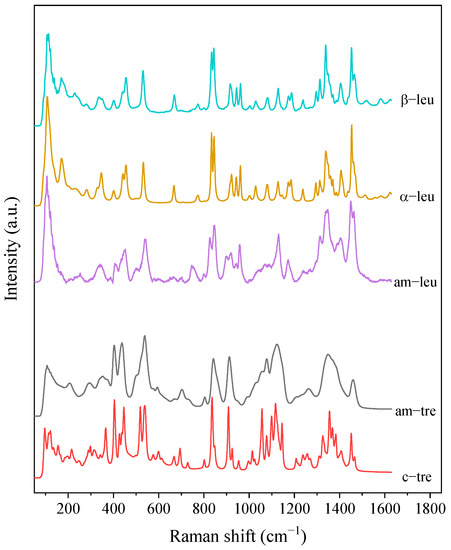 The measured reference Raman spectra of different solid phases for leucine (crystalline alpha = α-leu, crystalline beta = β-leu, and amorphous = am-leu) and trehalose (amorphous = am-tre, crystalline trehalose dihydrate = c-tre).