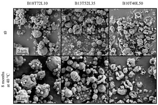 Micrographs of the spray-dried mannitol–leucine formulations at t0 and after 8 months of storage at 40 °C. The scale bar applies to all micrographs.