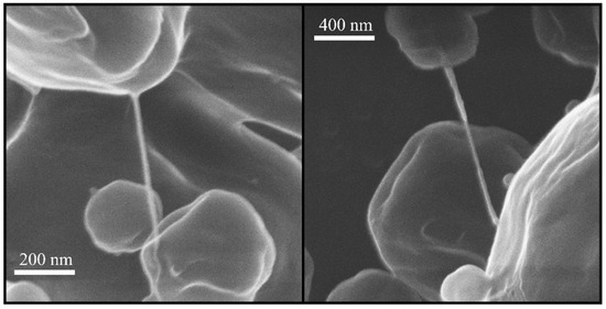 A helium ion microscope was used to image the fibers at higher magnifications in order to minimize the beam damage and preclude the possibility of the coating masking their actual shape. Two fibers from the B18T72L10 formulation after one month of storage at 40 °C are shown in Figure 3. The fibers had a high aspect ratio with lengths reaching several hundred nanometers and they were very thin with thicknesses approximately between 10 and 20 nm.