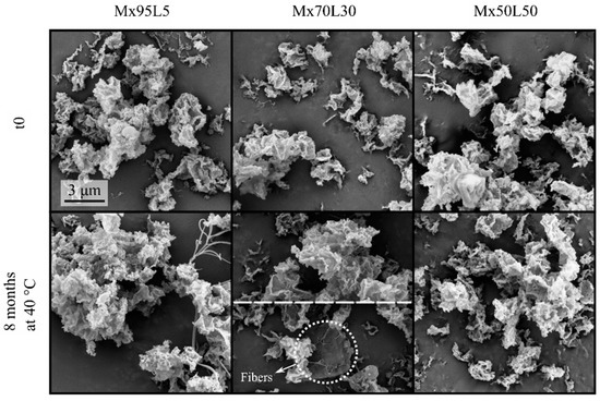 The spray-dried powders containing moxidectin and leucine are shown in Figure 4. In all formulations, the particles were thin-shelled and appeared to have low particle densities, probably due to the very low amorphous solubility of moxidectin in the cosolvent system, which in turn, could cause early phase separation during droplet evaporation. For up to 8 months of the stability challenge, no significant morphological change was observed. Particles retained their appearance without any signs of fusing. As in the first model system, fibers started appearing in the formulation with the least amount of leucine (Mx95L5) after 2 months of storage at 40 °C. After 8 months of storage at 40 and 25 °C, the Mx95L5 samples had developed many long fibers and some shorter ones. Only after 8 months were a very small number of fibers detected for the Mx70L30 formulation stored at the higher temperature of 40 °C. No fibers were detected for the Mx50L50 formulation.