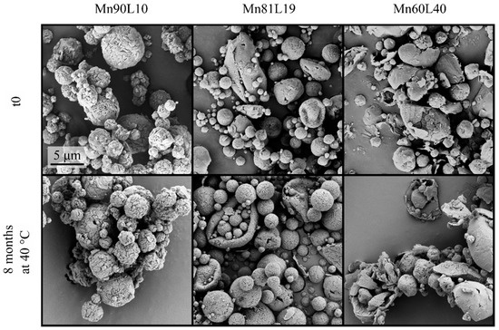 The morphology of the mannitol-containing powders is shown in Figure 5. The particles with the highest mannitol content had discernible nanoparticles with a regular morphology on the surface and a spherical, hollow structure. This formulation was designed to allow mannitol to crystallize earlier than leucine. The resulting morphology is consistent with mannitol crystals on the surface [39]. At higher leucine contents, where the crystallization sequence was predicted to be reversed, the larger particles had collapsed and were hollow with a thin shell, which is consistent with typical leucine particle morphology [18]. Many of the particles with the highest leucine fraction (Mn60L40) were broken, probably during the cyclone separation. As seen from the bottom row of this figure, all formulations were morphologically stable. No fibers were detected for any of the powders at any time point or in any storage condition.