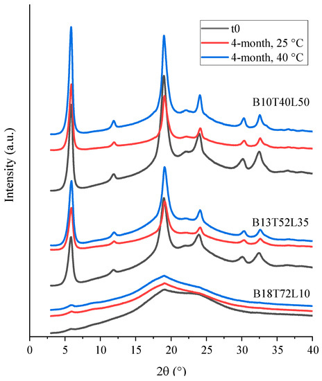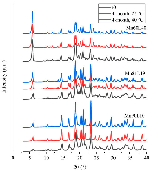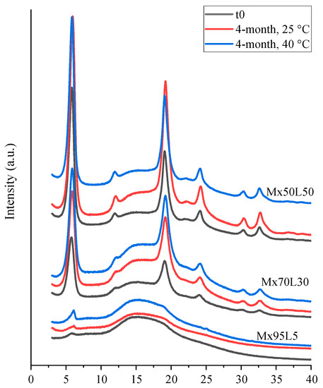 PXRD diffractograms of the spray-dried moxidectin–leucine powders at t0 and after 4 months of storage at 25 and 40 °C.