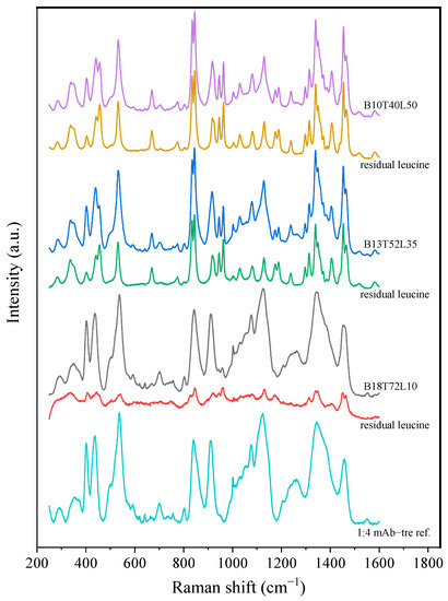 The solid state of the individual components of the spray-dried samples was analyzed using an in-house dispersive Raman spectrometer [31]. The raw crystalline materials of L-leucine and trehalose dihydrate were measured, with the results providing the reference spectra for the most stable crystalline polymorphs of these compounds, α polymorph for leucine and β polymorph for mannitol. However, it was later found that the residual spectra for some of the leucine-containing formulations could not be minimized when the α-leucine reference spectrum was used for the spectra deconvolution. Another conformational polymorph of leucine was previously observed at temperatures higher than 80 °C [32]. It was believed that such a less stable phase of leucine also appeared in spray-dried particles. In this study, the Raman spectra of a less stable polymorph of leucine, β-polymorph, was obtained from the residual spectra of spray-dried bevacizumab–trehalose–leucine formulation (B10T40L50) after subtracting the spectral contribution of bevacizumab and trehalose. The obtained reference spectrum manifested different features compared to that of α-leucine and was confirmed to be for the β polymorph of leucine [32].