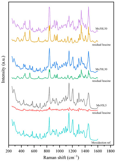 The PXRD diffractograms of the moxidectin–leucine powders are shown in Figure 8. Obvious crystalline peaks attributable to leucine could be observed for the powders containing 30% and 50% leucine, while the powder containing only 5% leucine showed weak peaks with a stronger amorphous background. Some peaks appeared during storage for the 5% leucine formulation. This could be attributed to the detection limit of the PXRD measurements and the dependence on the crystal size as Raman measurements confirmed that leucine was completely crystalline in this formulation. Raman spectroscopy could not detect amorphous leucine in any of the formulations, while moxidectin was completely amorphous. The raw and residual leucine spectra of these formulations are shown in Figure 9, only for the powders stored for 8 months at 40 °C, as there was no significant change in the spectra over time. As shown in Table 5, it was determined that the crystalline leucine in the Mx70L30 and Mx50L50 formulations resembled the β-form, i.e., the less stable polymorph. The residual spectra obtained from the Mx95L5 were of relatively poor quality, providing only confirmation that the majority of the leucine was in crystalline form; however, its exact polymorphism could not be determined. In summary, neither the PXRD nor Raman measurements revealed any significant changes in the solid state after 8 months of storage at 25 and 40 °C.