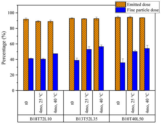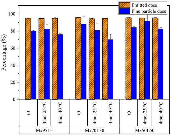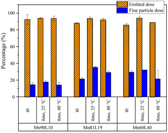 As with the other formulations, the aerosol properties of the moxidectin formulations were compared before and after 4 months of stability holds at 25 and 40 °C. The emitted dose and fine particle dose obtained from the NGI measurements are shown in Figure 13. The formulations had very high emitted doses of about 95% in all conditions. The unusually high values of fine particle doses were due to the smaller particle sizes of these formulations upon spray drying out of a water–ethanol cosolvent system, which results in smaller atomized droplets [42]. No statistically significant decrease in the fine particle dose was detected, pointing to good stability of aerosol performance for all powders during storage.
