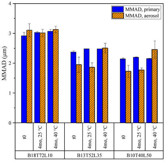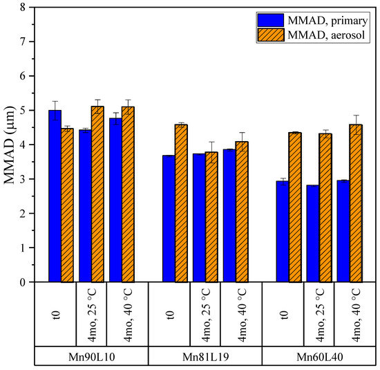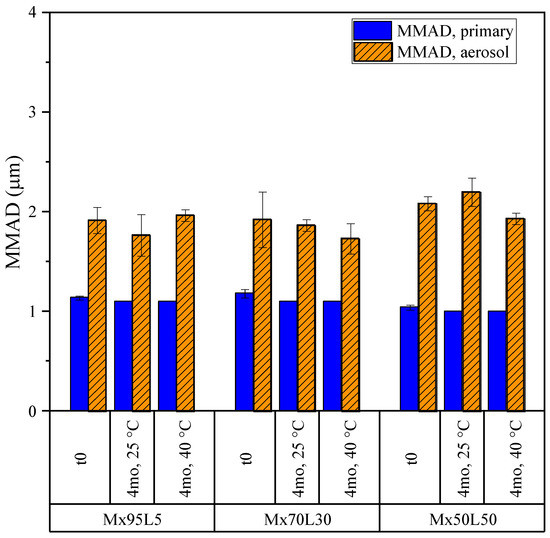 The MMADs of the same powders obtained from the NGI and APS measurements are shown in Figure 14. The MMADs of the moxidectin formulations in storage remained close to 1 µm for the primary particles and close to 2 µm for the aerosol, resulting in a very high fine particle dose, as discussed above. The difference between the MMADs obtained for the primary particle size distribution and those obtained for the aerosol suggests is in the incomplete de-agglomeration of these powders in the inhaler. Regardless, no significant change in the aerodynamic properties of the powders was observed in storage.