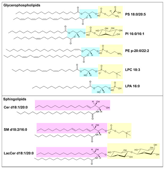 Schematic illustration of membrane lipids. In the upper box, example of glycerophospholipids: phosphatidylserine (PS) 18:0/20:5, phosphatidylinositol (PI) 16:0/16:1, alkenyl ether (plasmalogen) phosphatidylethanolamine (PE) p20:0/22:2, lysophosphatidylcholine (LPC) 18:3 and lysophosphatidic acid (LPA) 16:0. The glycerol moiety is marked in light blue, and the polar head is marked in yellow. In the lower box, examples of sphingolipids: ceramide (Cer) d18:1/20:0, sphingomyelin (SM) d18:2/16:0 and lactosylceramide (LacCer) d18:1/20:0. The pink box highlights the long-chain base (LCB), sphingosine, and the yellow one highlights the polar head. Structures have been made using the Structure Drawing Tools available at Lipid Maps [15].