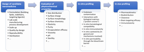 Many challenges have been identified as bottlenecks during the development and preclinical testing of lipid-based nanoformulations for brain-targeting that hamper their translation from the discovery-phase to clinical trials. The first critical hurdle encompasses the design of a suitable formulation that is capable to (i) transport a sufficient payload of the therapeutic agent, without premature leakage or off-target release, and to (ii) reach the efficient concentration at the target site within the brain, overcoming multiple biological barriers (opsonization and clearance by reticulo-endothelial system (RES), the BBB) [14]. During recent years, various ligands that either specifically bind to the receptors/target transporters overexpressed on the brain endothelial cells or impede recognition by RES have been utilized to achieve this goal. Traditional nanocarrier development has been based on a formulation-driven approach, engineered and characterized from a physicochemical perspective, without a comprehensive biological proof of concept [14]. However, this has imposed numerous concerns regarding quality, safety and efficacy of these sophisticated LNs, including the reproducibility of the manufacturing process and adaptation to large-scale production [15,16]. Therefore, a rational design of innovative LNs for optimized brain disposition requires integrated in chemico/in vitro/in vivo multiparameter-testing approach, summarized in Figure 1.