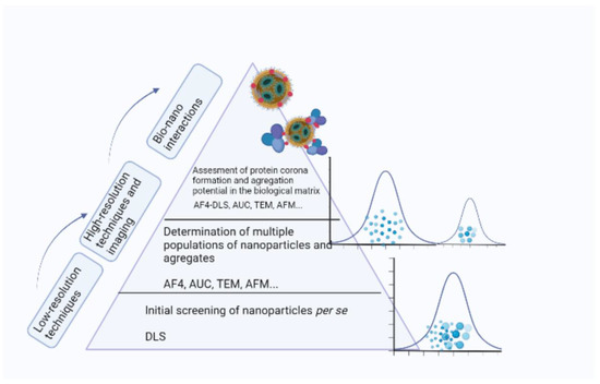 Necessary steps in the size characterization of nanoparticles (from bottom up): testing general sample properties applying low-resolution techniques; resolving multiple size populations of nanoparticles, aggregates, and larger particles; investigation on nanoparticle-protein interactions. Created with BioRender.com (accessed on 31 December 2022).