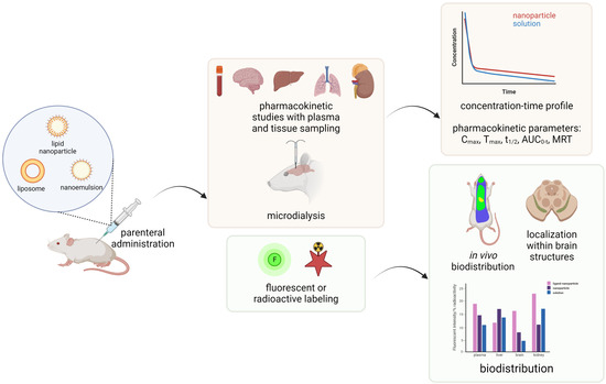 To select DDS with favorable properties for parenteral administration and targeted brain delivery, special attention must be paid to formulation factors in order to avoid any issues with drug targeting, such as DDS toxicity, premature release or unfavorable interactions with biological fluid components [23]. Given the toxicity of some polymeric nanoparticles, the focus of research has shifted to lipid-based nanocarriers, such as nanoemulsions, liposomes or nanoparticles, which exhibit good biocompatibility, biodegradability, and non-immunogenic properties [24]. These carriers can also be modified to achieve targeted drug delivery and improve pharmacokinetic properties. When DDS is administered parenterally, the first barrier to successful drug delivery relates to the plasma proteins that form the corona around the particles/droplets, thus determining systematic circulation time and biodistribution [25].