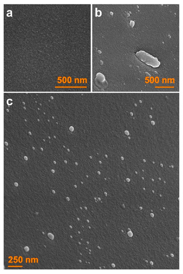 Scanning electron microscopy (SEM) images of an ASD extrudate. Some regions appear fully amorphous (a) or contain crystalline domains between 10 and 1000 nm (b,c). The length distribution of the domains found in (c) were measured as 38 ± 18 nm (±SD, n = 100). “Reprinted with permission from Moseson et al. [17]. Copyright 2022 American Chemical Society”.