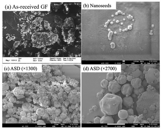 Nanoseeds were prepared successfully via wet stirred media milling. The median particle size d50 of the as-received GF was 13.7 µm, and the milled particles had a median size in the range of 146–223 nm, depending on the formulation. Their sizes were also measured before each seeded desupersaturation/dissolution experiment, and no noticeable deviation was observed. Spray drying was performed to prepare GF ASDs. The TGA results indicated ~2.0% weight loss, which refers to any residual solvent/moisture from spray drying and moisture sorbed from the air during the processing, sampling, and measurements (room at 23 °C, ~40% RH) (e.g., [21]). In view of the higher normal boiling point of water (100 °C) as compared with those of acetone and ethanol (56 °C [48] and 78 °C [49], respectively), it is reasonable to expect that the residual liquid in the ASDs was significantly enriched in water because low-boiling solvents are preferentially removed during the spray-drying, leading to negligible organic solvent amounts in the ASDs (e.g., [50]). Table 3 presents the characteristic particle sizes d10, d50, and d90 of the ASDs, where the median size ranged from 5.15 to 8.82 µm. The particle sizes observed through SEM images corroborate the particle size measurements by DLS and laser diffraction. Figure 2a shows the large as-received GF particles with irregular shapes, while Figure 2b shows individually standing, non-aggregated rounded GF particles whose sizes match the DLS measurements qualitatively. Figure 2c,d depicts that the spray-dried ASD had spherical particles whose sizes fall within the particle size distribution measured by laser diffraction.