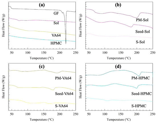 DSC thermograms of (a) as-received GF, Sol, VA64, and HPMC as well as of physical mixtures (PMs) of GF-polymer-SDS, overnight-dried nanoseeds, and the spray-dried ASDs containing (b) Sol, (c) VA64, and (d) HPMC as the polymer.
