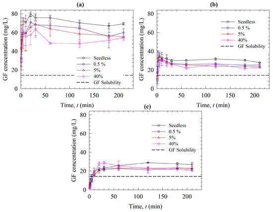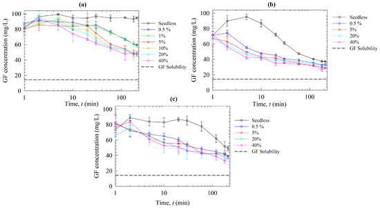 Next, let us examine the seeded tests. Interestingly, Sol could not completely prevent crystal growth in the presence of even 0.5% nanoseeds. While being an excellent nucleation inhibitor of GF, Sol appears not to be an excellent growth inhibitor of GF. The high surface area of the nanoseeds, coupled with the inherent fast-crystallizing nature of the GF [53], could explain these findings. At the low nanoseed loading (0.5, 1%), the desupersaturation was relatively slow, and the GF concentration was above ~60 mg/L, whereas it was much faster at the higher nanoseed loading (5–40%). For HPMC and VA64, the impact of seed loading was not as distinct as that for Sol between the low and high seed loading. The mere presence of 0.5% nanoseeds led to desupersaturation down to 40 mg/L within 52 and 196 min for VA64 and HPMC, respectively.